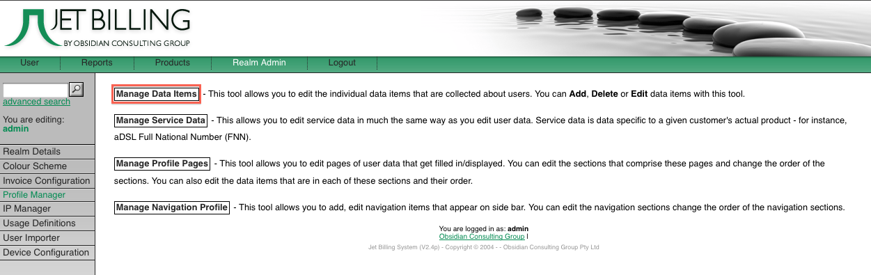 To manage Data Items you need to go to the Profile Manager tool and click on the Manage data items button.