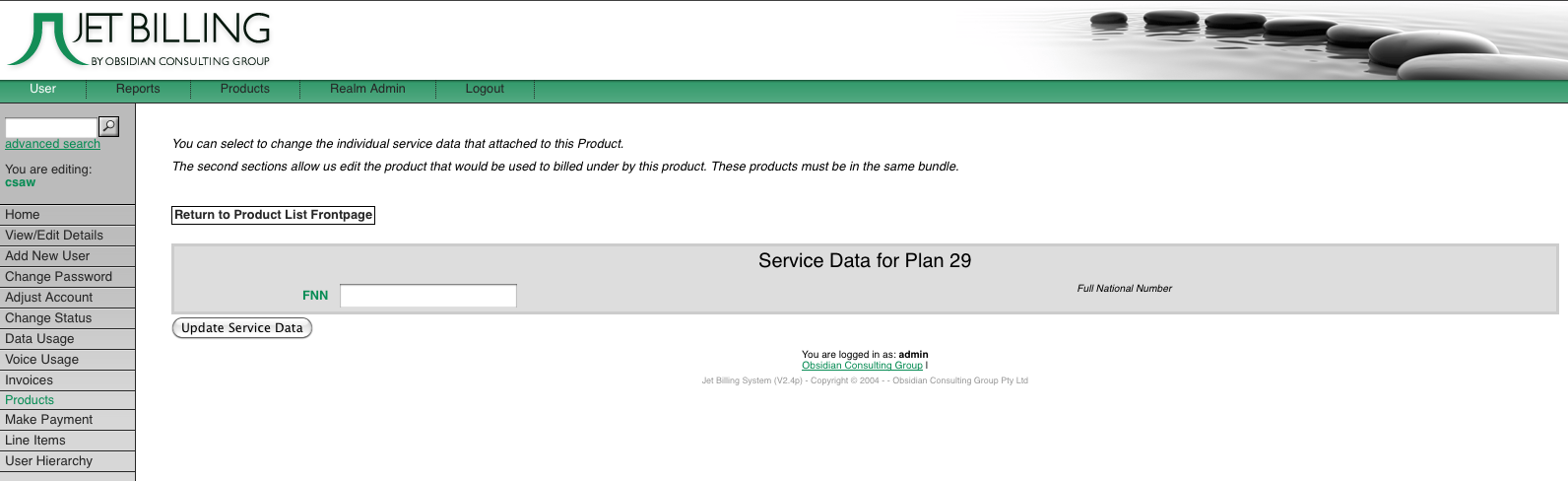 The ‘Products’ functional area shows all products which currently exist in your system, and allows you to edit these and to create new products. It is reached using the upper navigation bar. The products functional area, also known as the ‘plan manager’, is the topic of the current manual.*